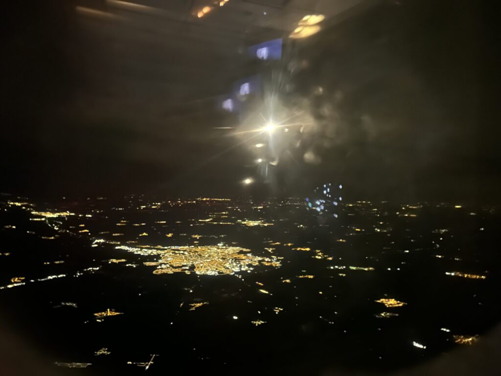 Je me réveille d’un sommeil lourd, nous sommes déjà au-dessus de l’Allemagne ou de l’Alsace ; du ciel, je vois cette guirlande, village de lutins, de fées dans des chaumières. Je suis dans un film d’animation, Klaus, Polar Express.