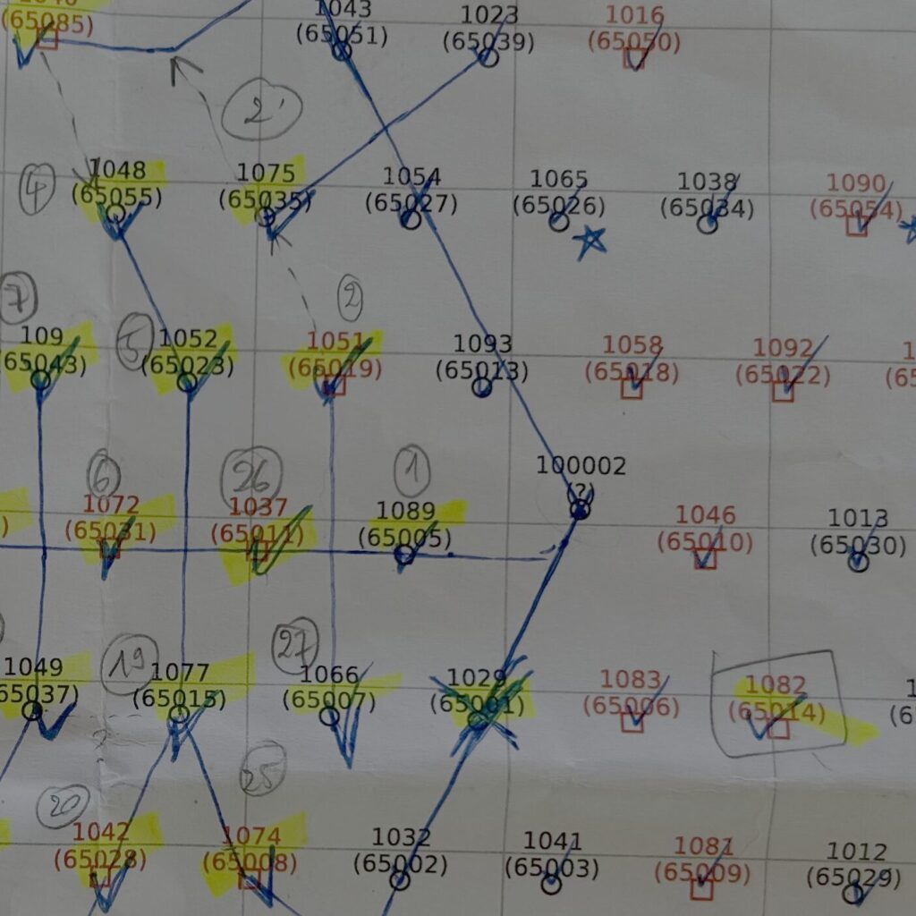 Le soir dans la Work Room, O., V., Bohao et les autres se battent avec la stabilité de leur code de trigger, F. fait un premier tri de nos données. Xx et Px font des aller-retours dans le noir pour tester des cartes électroniques modifiées sur une unité proche. Je suis lessivée, lutte contre le sommeil, et planifie sur une carte en papier la campagne du lendemain : il ne faut pas se tromper, nous levons le camp à 14h et il nous reste 30 antennes. J’optimise le chemin, on a mieux appris aujourd’hui comment parcourir le désert : repérer les routes et les détecteurs, et que les rivières coulent Nord-Sud.