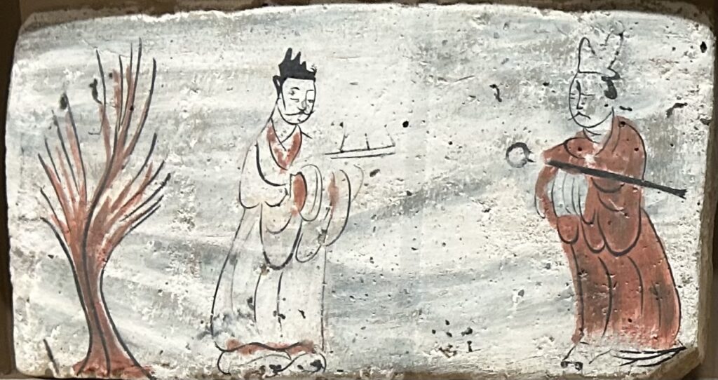 Brique peinte, représentant une récolte de feuille de mûriers, retrouvée dans un groupe de tombes au sud de la ville de Lutuo, dynasties Wei et Jin, 220-280 AD, Musée de Dunhuang