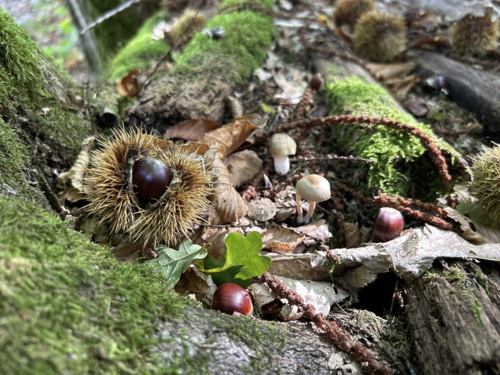 En face, de l’autre côté de la clairière en contrefort, la vieille maison au toit rouge, dans la touffe de forêt plaquée du soleil de fin d’après-midi. De ce côté-ci l’odeur de terre en préparation de feuilles crispées le hennissement des chevaux et des bogues qui choient la buse variable tracée dans le ciel le craquement des branches qu’on piétine l’éclat des châtaignes et leur lustre sous les doigts de rainures et de pointe, rond triangle tendu vers le ciel et les bolets roussissants à la légère exhalaison la mousse très verte entre les doigts de pieds des chênes, des charmes, des bouleaux.
